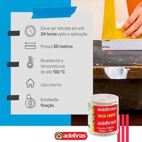 A Fita Mask Crepe 710 possui um papel com excelente alongamento, proporcionando boa performance em curvas e contornos do mascaramento. Utilizada para uso industrial, mascaramento de pinturas imobiliárias, trabalhos escolares, fixações, proteção, enfaixamentos, artesanato, decoração, bricolagem, etc. Depois de aplicada, esse modelo de fita crepe não deixa resíduo na superfície. Resistente a temperaturas de até 100C. Deve ser removida em até 24 horas após a aplicação.
