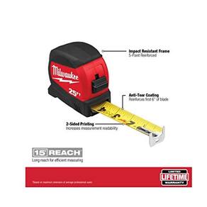 Milwaukee Fita métrica compacta de lâmina larga de 7,6 m x 3 cm (pacote com 2) - Milwaukee Fita métrica 48-22-0425, lâmina de 7,6 m L, lâmina de 1/5.1 cm, lâmina de aço, capa ABS, caixa preta/vermelha - Nossa fita métrica compacta de 7,6 metros de largura tem até 4,5 metros de alcance, permitindo que você faça medições rapidamente. - A fita é resistente ao desgaste e a impactos com proteção da lâmina de nylon e uma fita resistente ao desgaste e a impactos com proteção da lâmina de nylon e um revestimento adicional anti-rasgo nos primeiros 15 cm da lâmina, reduzindo o rasgo da fita. Revestimento antirasgo adicional nos primeiros 15 cm da lâmina, reduzindo o rasgo da fita. - . Construídas para suportar o local de trabalho, as fitas métricas compactas são construídas com uma estrutura reforçada de cinco pontos para resistência a impactos. - Pacote com 2.