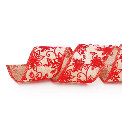 Fita juta com poinsetias vermelhas 6,3cm - Cor Predominante: CRU - Materia Prima: 100% Poliéster - Instruções de Limpeza: Não lavar e não passar - Destaques: Nossa coleção de fitas Natalinas apresentam belos desenhos e combinações de cores que conferem elegância e criatividade a qualquer espaço. Das cores clássicas as mais ousadas, que permitem diversas combinações essas fitas adicionam profundidade e textura à árvore de Natal, guirlandas e laços.