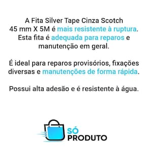Descrição A fita silver tape cinza scotch 45 mm x 5m é mais resistente à ruptura. Esta fita é adequada para reparos e manutenção em geral. Ela vai te ajudar a consertar as coisas rapidinho e deixar tudo como novo em pouco tempo é ideal para reparos provisórios, fixações diversas e manutenções de forma rápida. Possui alta adesão e é resistente à água.
