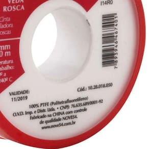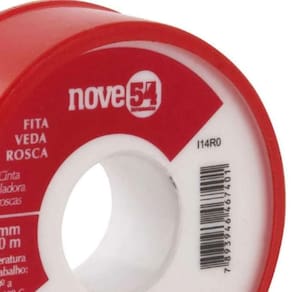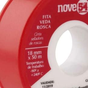 Fita Veda Rosca 18mmx50m Ptfe Teflon - Nove54 Conteúdo da embalagem 1 Fita veda rosca Aplicações e dicas de uso Indicada para vedação de conexões roscadas. Validade indeterminada Destaques e diferenciais Possui embalagem em estojo plástico que aumenta a vida útil do produto e facilita a aplicação DETALHES TÉCNICOS