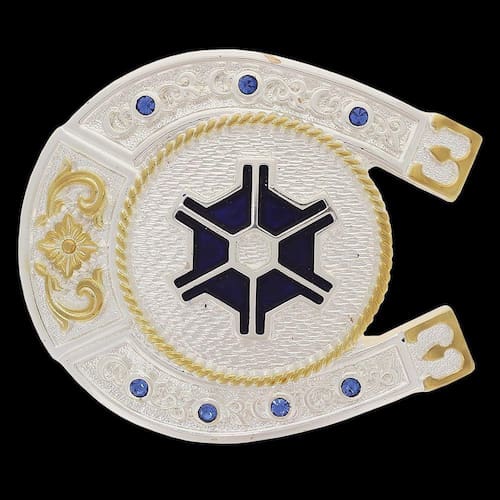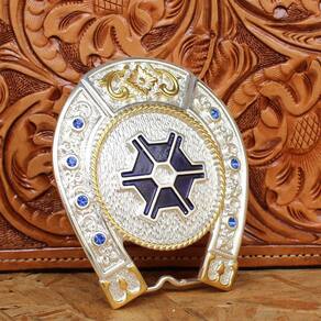 Fivela Agronomia Pelegrini fabricada em metal com detalhes em alto relevo e banhada nas cores Prata e Dourado e detalhes em pedras strass.