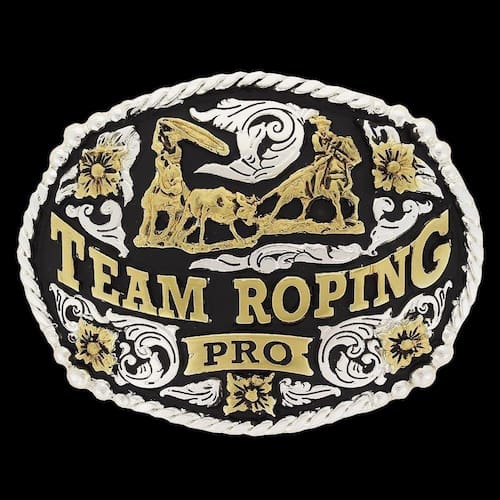 Fivela Country Team Roping Pro marca Master, fabricada em liga de zinco com banho Dourado/ Prata/ Preto e proteção em verniz. Encaixe ideal para cintos de até 4cm de largura.