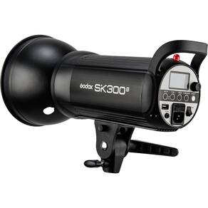 O SK300II pesa 1,9 kilos, possui encaixe para sombrinha e pode ser fixado em um tripé de iluminação. Compatível somente com voltagem 110V.