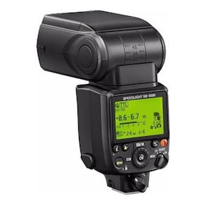 o sistema de resfriamento flash montado em sapata com um design de dissipação de calor permite mais de 100 rajadas na saída total sem superaquecimento número guia de 113' em iso 100 e 35mm ou 180' em iso 100 e 200mm cobertura de 14-24mm em fx ao usar o painel de difusão grande angular embutido