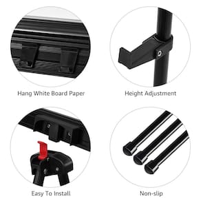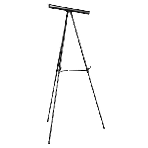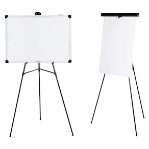 - Cavalete de flipchart com suportes ajustáveis para segurar quadros brancos e sinalização e também tem um clipe superior removível para blocos de papel ou telas