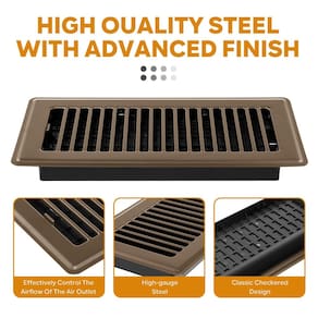 - ?Material de qualidade superior?Nossas coberturas de ventilação para piso doméstico são construídas em aço de alta qualidade, ideais para ar condicionado, aquecimento e vários sistemas. A superfície dupla para registro de piso é revestida com um pré-revestimento resistente à ferrugem, garantindo a longevidade da sua grade de piso e aparência impecável em qualquer ambiente.