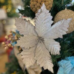 Para complementar a sua decoração de natal as flores pratas decorativas com glitter é a opção perfeita , trazendo para a decor da sua casa na época mais linda do ano , o toque final que faltava.
