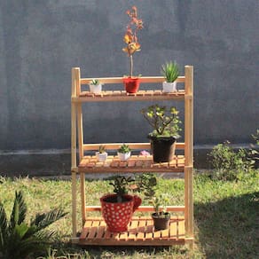 A Floreira de Madeira Maciça com três prateleiras combina funcionalidade e charme rústico.