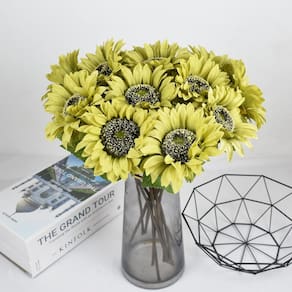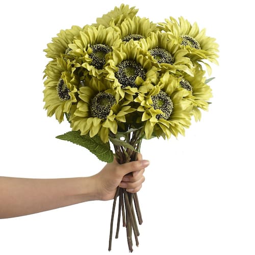 WISTART Flores de girassol artificiais verdes, 8 peças, haste longa única, girassóis falsos, buquê de casamento, arranjos de flores amarelas falsas para uso ao ar livre - Material: As hastes longas de girassóis artificiais são feitas de tecido de seda de alta qualidade, assim como a flor real e as hastes são feitas de arame de aço por dentro e plástico por fora, recomenda-se dobrar o caule para caber no vaso. - Tamanho: girassol falso altura: 15,74 polegadas / 40 cm, cabeça de girassol 5,5 polegadas / 14 cm de diâmetro. Este girassol de seda realista pode combinar rosas, flores de múmia pompom, hálito de bebê e hortênsias. - Flores de toque real: 8 buquês de girassol realistas nunca murcham e permanecem bonitos o tempo todo. Flores artificiais preservam a beleza das flores frescas, são mais baratas e duram mais do que flores frescas. - Arranjos de flores: decorações de casamento, buquês de noiva para casamento, boutonnieres, chá de bebê, decoração de casa para decoração de sala de estar ou cozinha, flores rosa amaranto em vasos para centros de mesa, suprimentos de festa, adicionando um pouco de calor ao escritório, decoração de mesa e buquê de girassol DIY. - Dicas quentes de girassóis falsos: a cabeça dos girassóis pode ficar ligeiramente comprimida durante o transporte, mas pode ser facilmente devolvida à sua forma correta. Não se preocupe, depois de receber os itens, você pode usar um secador de cabelo para restaurar.