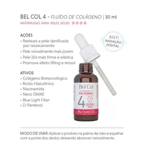 Desenvolvido para Peles Secas, associado a mais de 13 ativos. Promove Rejuvenescimento, Firmeza auxiliando também na restauração, vitalidade e eliminando o ressecamento da pele. BENEFÍCIOS: *Hidratação Intensa; *Reduz Marcas de Expressão e Pés de Galinha; *Promove Efeito Lifting; PRINCIPAIS ATIVOS: *Colágeno Biotecnológico; *Ácido Hialurônico; *Niacinamida; *Elastina; *Biosaccharide Gum-1 e 2; *Nano DMAE; *D-Pantenol; *Extratos de Capuchinha; *Flor de Maracujá; *Groselha Negra; *Uva; *Aroeira-Vermelha; *Óleo Essencial de Lavanda; MODO DE USO: Profissional: Indicado para sessões de tratamento estético em cabine utilizando recursos de eletroterapia e/ou antes de máscaras. Home Care: Com a pele Limpa, aplicar 5 gotas na palma da mão e espalhar sobre o rosto, pescoço e colo promovendo movimentos até completa absorção do produto. Recomendamos o uso duas vezes ao dia: Manhã e a Noite. PRECAUÇÕES: Em caso de contato acidental com os olhos, enxaguar abundantemente. Em caso de irritação, suspenda o uso. Ean: 7898957344666