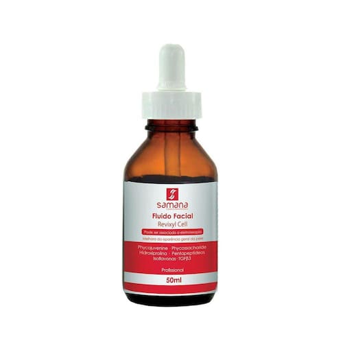 Fluido Revixyl Cell 50Ml - SamanaFluido Facial que estimula a síntese de colágeno, aumenta a firmeza e diminui os sinais do envelhecimento. Sua formulação contém Phycojuvenine que tem como função estimular a síntese de colágeno e elastina, promovendo assim uma pele mais firme e jovial. Pode ser associado à eletroterapia.Benefícios: Promove a renovação cutânea e a melhora geral da aparência da pele, pode ser associado à eletroterapia.Indicação: Indicado para peles maduras, desvitalizadas e rugas profundas.Principais Ativos: Phycojuvenine, Phycossacharide, Hidroxiprolina, Pentapeptídeos, Isoflavonas e TGF3.