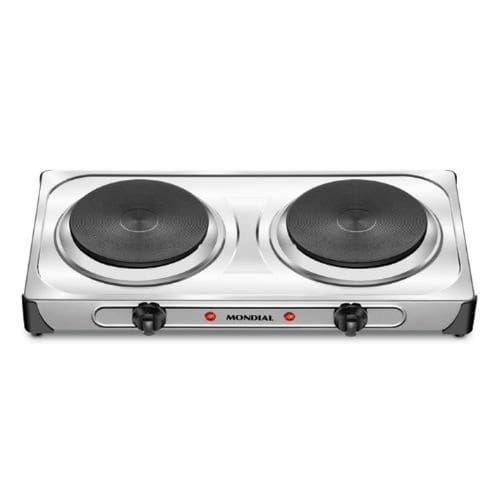 Fogão elétrico portátil Mondial Fast Cook Dual Inox com 2000W de potência total, 6 níveis de temperatura, e design em inox.Luz de calor residual