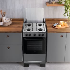 O Fogão 4 Bocas de Piso com Mesa de Inox une design moderno e alta performance com 7,34 kW de potência total e acendimento automático. Equipado com botões Front Control frontal da mesa e puxador ergonômico, ele oferece máxima segurança e praticidade no manuseio diário. Suas trempes de duplo arame garantem estabilidade, enquanto os pés altos facilitam a limpeza do ambiente. O forno de 48 litros possui acabamento Limpa Fácil, porta de vidro duplo e visor amplo para total controle dos seus assados. Sendo Bivolt e robusto, este modelo é a escolha funcional e elegante para transformar sua cozinha.