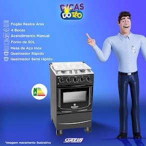 Características: Mesa : Aço inox selada; Queimadores : Esmaltados; Acendimento : Automático; Forno : Easy clean; Puxador da porta do forno: Tubo metálico;