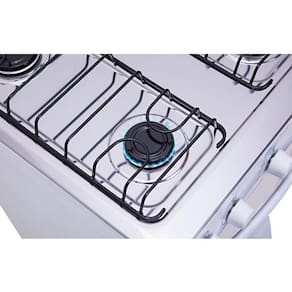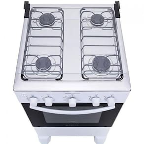 Possui mesa em inox, tampa de vidro na mesa, grades duplas de aço esmaltado, acendimento automático e botões removíveis que facilita na hora da limpeza.