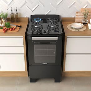 Diferenciais do produto: Mais espaço e estabilidade: Trempes individuais em ferro fundido com 8 apoios garantindo maior estabilidade para as panelas. Tecnologia: Painel touchscreen com timer digital, acendimento automático e função de bloqueio para mais segurança e agilidade na cozinha. Durável e prático: Mesa de vidro temperado e manípulos removíveis para facilitar a limpeza do dia a dia. Ergonomia: Novo puxador em alumínio escovado com design robusto para maior segurança e conforto ao abrir a porta do forno. Tecnologia limpa fácil: Revestimento interno do forno limpa-fácil. Espaçoso e completo: Forno amplo com 58L de capacidade. Funcionalidade: Duas prateleiras e luz do forno blindada.
