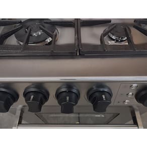 Esse Fogão é construído em aço inoxidável, com grades em ferro fundido esmaltado, botões texturizado na cor preta.