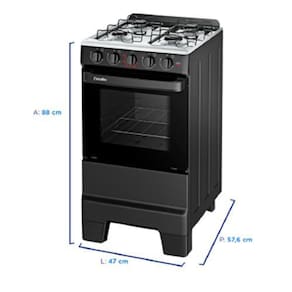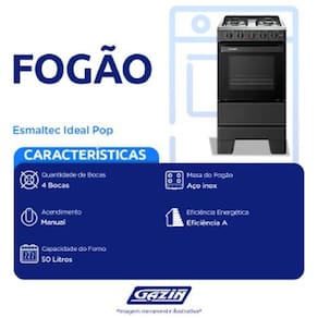 Fogao 4b Esmaltec Ideal Pop S/acend - 0104002939 Forno: B Tipo de gás: GLP Potência: 8,85 kW Volume do forno: 50 litros Outras informações : 12 meses Origem: Nacional Dimensões Altura: 88 cm Largura: 47 cm Profundidade: 57,6 cm Peso: 16,8 kg Cor: PRETO - Voltagem: SEM VOLTAGEM DESCRIÇÃO Mesa de aço inox com espaldar. Trempes duplas em aço esmaltado: mais facilidade de limpeza. Pés retos de fácil encaixe: mais altos, fortes e seguros. Puxador mais resistente, robusto e ergonômico. Forno Limpa Fácil. 1 prateleira ajustável. Porta do forno em vidro total. Vidro interno removível. Acendimento manual. Queimadores: 1 família e 3 pequenos. Clássificação: Mesa: A Marca: Não Informado