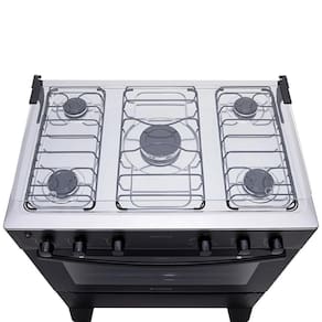 Possui mesa em inox, tampa de vidro na mesa, grades duplas de aço esmaltado, acendimento automático e botões removíveis que facilita na hora da limpeza. 2 queimadores de 1,7kW, 2 queimadores Família de 2,0kW e 1 queimador Mega Chama de 3,0kW. O forno possui visor amplo na porta, que permite enxergar tudo o que está dentro, acabamento limpa fácil, 1 grade deslizante e porta com vidro duplo - que preserva o calor.