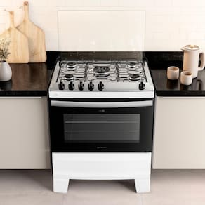 O fogão 5 Bocas Branco com Mesa Inox Atlas Agile Up é o destaque que sua cozinha merece, e agora também em mesa de inox! O puxador da porta do forno é em alumínio escovado, dando elegância ao seu amplo forno de 86,5 litros e duas grades deslizantes. Além disso, o forno possui um visor amplo para verificar seus alimentos. A versão com 5 queimadores ainda conta com Tripla Chama para você preparar qualquer receita ainda mais rápido. Confira mais características: