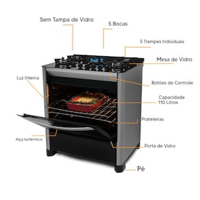 Se você procura um fogão potente, espaçoso e ideal para preparar grandes receitas, este modelo 5 bocas com forno de 110 litros é a escolha perfeita.