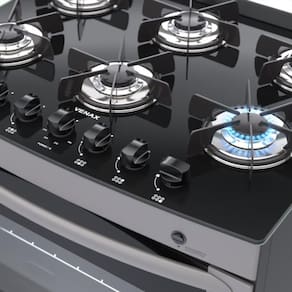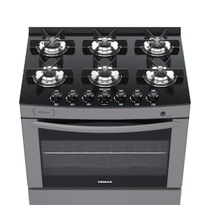 Tipo: Fogão de Piso Acendimento: Automático Queimadores: 2 Grandes e 4 Médios Trempe dos Queimadores: Individual Esmaltada Mesa Queimadores: Vidro Preto Base das Trempes: Inox Botões: Removíveis Válvula de Segurança: Sim Luz no Forno: Não Prateleiras do Forno: Uma Regulável Revestimento do Forno: Esmalte Easy Clean Temperatura: 5 posições de 180C Até 290C Função Grill: Não Timer Grill: Não Timer Gás: Não Espeto Giratório: Não Bandeja Coletora de Resíduos: Não Porta Removível: Sim Porta do forno: Vidro Preto Vidro Duplo na Porta: Sim Puxador da Porta: Aço Pintado Estufa: Fixa Puxador da Estufa: N/A Entrada de Gás: Uma Entrada(Lado Esquerdo Visto de Frente) Cores das Laterais: Preto Fosco Marca: Venax