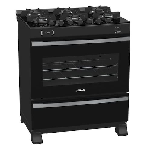 Tipo: Fogão de Piso Acendimento: Automático Queimadores: 2 Grandes e 4 Médios Trempe dos Queimadores: Individual Luxo Esmaltada Mesa Queimadores: Vidro Preto Base das Trempes: Esmaltada na cor Preta Botões: Removíveis Válvula de Segurança: Sim Luz no Forno: Sim (Lâmpada não acompanha o produto) Prateleiras do Forno: Duas Auto Deslizantes Revestimento do Forno: Esmalte Easy Clean Temperatura: 5 posições de 180C Até 290C Função Grill: Não Timer Grill: Não Timer Gás: Não Espeto Giratório: Não Bandeja Coletora de Resíduos: Não Porta Removível: Sim Porta do forno: Vidro Panorâmico Preto Vidro Duplo na Porta: Sim Puxador da Porta: Alumínio Polido Estufa: Móvel com vidro preto Puxador da Estufa: Alumínio Polido Entrada de Gás: Uma Entrada(Lado Esquerdo Visto de Frente) Cores das Laterais: Preto Fosco Marca: Venax