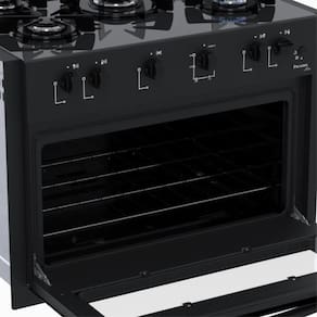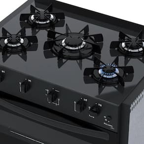 -5 bocas: 3 queimadores grandes (1,80kW) e 2 médios (1,35kW) -Mesa de vidro preto resistente -Trempes individuais esmaltadas -Forno Easy Clean com capacidade de 88,3L -Porta com vidro duplo panorâmico e puxador em aço preto -Acendimento automático total -Prateleira regulável e deslizante no forno -Entrada de gás lateral esquerda -Classificação energética “A” – mais economia -Voltagem: Bivolt -Dimensões (LxAxP): 82,7 x 63 x 61 cm -Peso: 36,5 kg
