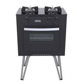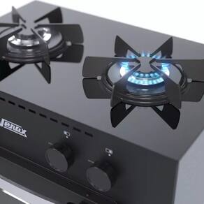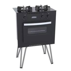 Fogão Portátil 2 Bocas Mini Cook, Mesa de Vidro, Trempes Individuais Esmaltadas, Visor na Porta do Forno, Puxador em Alumínio, Gás GLP Baixa Pressão, Forno Easy Clean.