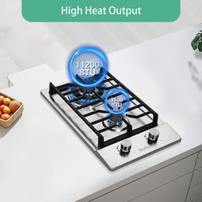 - ?2 queimadores de alta eficiência?O fogão Hothit a gás de 12 polegadas está equipado com 2 queimadores potentes, incluindo um queimador semi-rápido de 3.500 BTU e um queimador rápido de 11.200 BTU. Com uma potência total de até 14.700 BTU, pode economizar tempo de cozimento e atender às suas várias necessidades culinárias
