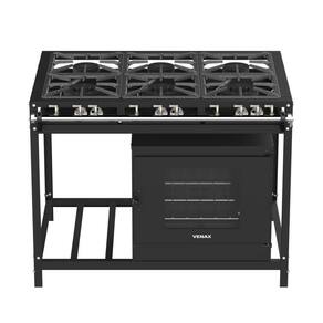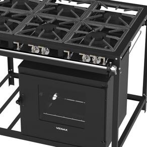 Tipo: Fogão industrial Marca: Venax Acendimento: Manual Queimadores: 3 Queimadores duplos(150mm) e 3 queimadores simples(120mm) Espalha chama: Ferro fundido Trempe dos queimadores: Ferro fundido(300x300mm) Mesa dos queimadores: Aço revestido com pintura eletrostática Perfil da mesa: Estilo "U" (60mm) Bandeja coletora de resíduos: Sim Botões: Metálicos Forno: Sim Prateleira do forno: 1 Regulável Revestimento do forno: Esmalte limpa fácil Isolamento do forno: Lã de vidro Termômetro no forno: Não Porta do forno: Aço com visor de vidro Puxador da Porta: Aço com baquelite Estrutura do fogão: Aço revestido com pintura eletrostática Entrada de gás: Dupla(reversível) Medidas do produto: Altura 84cm - Largura 107cm - Profundidade 84cm