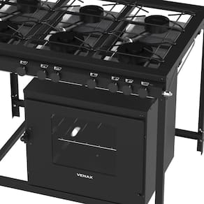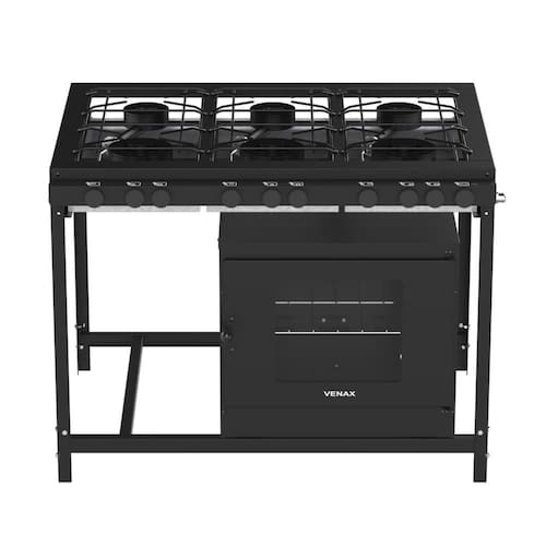 Tipo: Fogão industrial Marca: Venax Acendimento: Manual Queimadores: 3 Queimadores duplos(150mm) e 3 queimadores simples(120mm) Espalha chama: Ferro fundido Trempe dos queimadores: Esmaltadas Mesa dos queimadores: Aço revestido com pintura eletrostática Perfil da mesa: Estilo "U" (60mm) Bandeja coletora de resíduos: Sim Botões: Removíveis Forno: Sim Prateleira do forno: 1 Regulável Revestimento do forno: Esmalte limpa fácil Isolamento do forno: Lã de vidro Termômetro no forno: Não Porta do forno: Aço com visor de vidro Puxador da Porta: Aço com baquelite Estrutura do fogão: Aço revestido com pintura eletrostática Entrada de gás: Uma entrada, lado direito visto de frente Medidas do produto: Altura 84,5cm - Largura 109,5cm - Profundidade 82cm