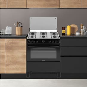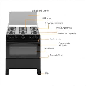O forno de 82 litros é amplo e funcional, permitindo assar diferentes pratos com eficiência. Equipado com porta com vidro amplo, facilita o acompanhamento do preparo sem perda de calor. O acabamento em preto moderno adiciona elegância e sofisticação à sua cozinha.