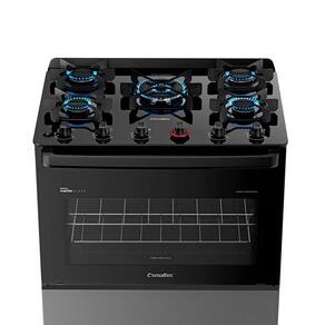 O acendimento automático proporciona agilidade no uso, enquanto os 5 queimadores (1 tripla chama, 2 família e 2 pequenos) oferecem potência e flexibilidade para diferentes tipos de preparo.