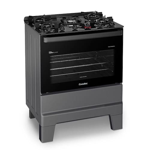O acendimento automático proporciona agilidade no uso, enquanto os 5 queimadores (1 tripla chama, 2 família e 2 pequenos) oferecem potência e flexibilidade para diferentes tipos de preparo.