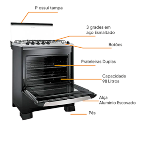 O forno espaçoso, com capacidade de 98 litros, oferece visão ampla com luz interna, facilitando o acompanhamento das receitas. As grades deslizantes, o revestimento limpa fácil e o design bem planejado tornam o uso ainda mais intuitivo e eficiente.