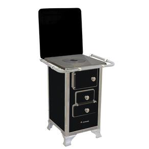 O Fogão a Lenha 00 é Pequeno, conta com corpo totalmente em aço carbono com acabamento esmaltado a fogo na pintura Preto. Seus pés são em ferro fundido com pintura em alumínio, contando também com cantoneiras em aço inox e guarnições em ferro fundido cromado garantindo qualidade exclusiva e um ótimo acabamento da peça.