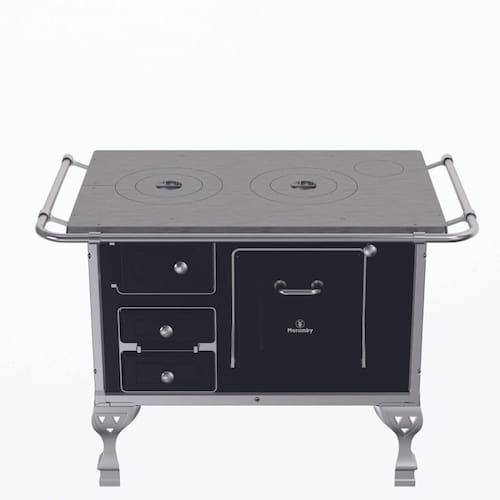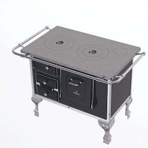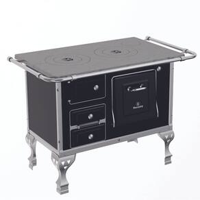 Fogão a lenha com chapa fundida e polida, frente e laterais esmaltadas, gaveta para cinzas, forno esmaltado com espelho em aço inox, quadros em alumínio, guarnições em aço esmaltado, puxadores e cantoneiras em aço inox, pés em ferro fundido.Tipo
