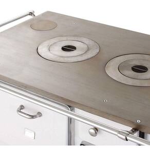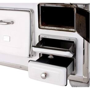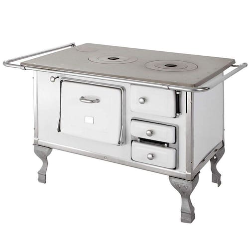 Características: Chapa fundida e polida Frente e laterais esmaltadas Gaveta para cinzas Forno com acabamento em esmalte Espelho do forno em aço inoxidável Quadros em alumínio e guarnições em chapa de aço esmaltado Puxadores, escoras e cantoneiras em aço inoxidável Entrada regulável de ar Capacidade do forno de 30 litros Pés de ferro fundido pintados em alumínio Saída de chaminé na chapa e atrás (lado esquerdo ou direito)
