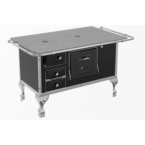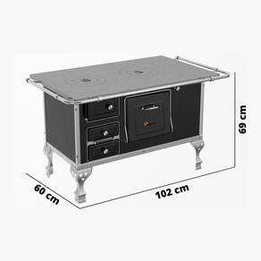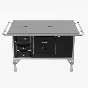 Chapa fundida e polida, Frente e laterais esmaltadas, Gaveta para cinzas, Forno com acabamento em esmalte, Espelho do forno em aço inoxidável, Quadros em alumínio e guarnicoes em chapa de aço esmaltado, Puxadores, escoras e cantoneiras em aço inoxidável, Entrada regulavel de ar, Capacidade do forno de 30 litros, Pes de ferro fundido pintados em alumínio, Saida de chamine na chapa e atras (lado esquerdo ou direito)Tipo