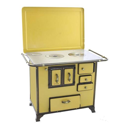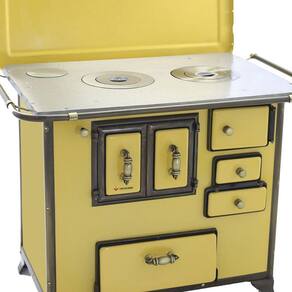 O Fogão a Lenha Barroco Número 03 de Gabinete conta com corpo e forno totalmente em aço carbono com acabamento esmaltado a fogo na pintura Amarela. Seus pés são em ferro fundido com acabamento em ouro envelhecido no modelo rústico, conta também com varões em tudo de aço e guarnições em ferro fundido também com acabamento em ouro envelhecido garantindo qualidade exclusiva e um ótimo acabamento no seu Fogão a Lenha.