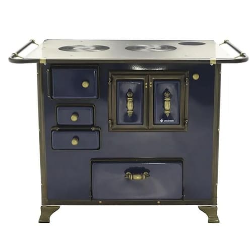 O Fogão a Lenha Barroco Número 03 de Gabinete conta com corpo e forno totalmente em aço carbono com acabamento esmaltado a fogo na pintura Azul. Seus pés são em ferro fundido com acabamento em ouro envelhecido no modelo rústico, conta também com varões em tudo de aço e guarnições em ferro fundido também com acabamento em ouro envelhecido garantindo qualidade exclusiva e um ótimo acabamento no seu Fogão a Lenha.