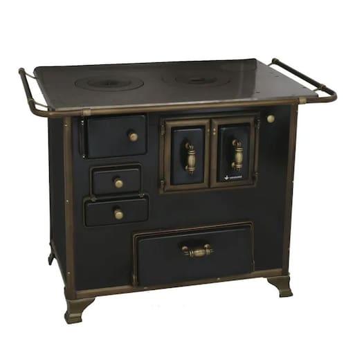 Corpo e forno em aço carbono com acabamento esmaltado a fogo. Pés em ferro fundido com acabamento em ouro envelhecido. Varões e guarnições em ferro fundido com acabamento em ouro envelhecido. Puxador e escoras do varão em zamak com acabamento ouro envelhecido. Chapa em ferro fundido com super polimento. Compartimento inferior para armazenar lenha. Saída da chaminé direita.Tipo