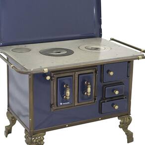 O Fogão a Lenha 03 da Linha Barroco conta com corpo e forno totalmente em aço carbono com acabamento esmaltado a fogo na pintura Azul. Seus pés são em ferro fundido com acabamento em ouro envelhecido, contando também com varões em tubo de aço e guarnições em ferro fundido também com acabamento em ouro envelhecido garantindo qualidade exclusiva e um ótimo acabamento no seu Fogão a Lenha.