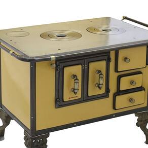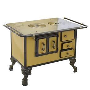 O Fogão a Lenha 03 da Linha Barroco conta com corpo e forno totalmente em aço carbono com acabamento esmaltado a fogo na pintura Amarela. Seus pés são em ferro fundido com acabamento em ouro envelhecido, contando também com varões em tubo de aço e guarnições em ferro fundido também com acabamento em ouro envelhecido garantindo qualidade exclusiva e um ótimo acabamento no seu Fogão a Lenha.