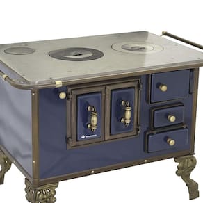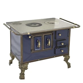 O Fogão a Lenha 03 da Linha Barroco conta com corpo e forno totalmente em aço carbono com acabamento esmaltado a fogo na pintura Azul. Seus pés são em ferro fundido com acabamento em ouro envelhecido, contando também com varões em tubo de aço e guarnições em ferro fundido também com acabamento em ouro envelhecido garantindo qualidade exclusiva e um ótimo acabamento no seu Fogão a Lenha.