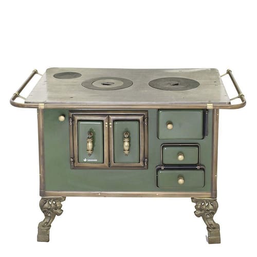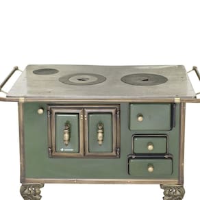O Fogão a Lenha 03 da Linha Barroco conta com corpo e forno totalmente em aço carbono com acabamento esmaltado a fogo na pintura Verde. Seus pés são em ferro fundido com acabamento em ouro envelhecido, contando também com varões em tubo de aço e guarnições em ferro fundido também com acabamento em ouro envelhecido garantindo qualidade exclusiva e um ótimo acabamento no seu Fogão a Lenha.