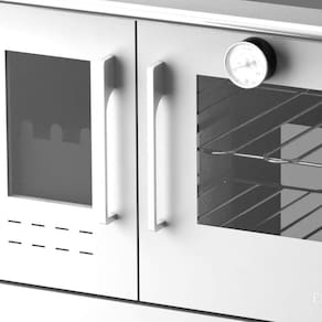 Chapa de alumínio, forno, grade do queimador em ferro fundido, varão de proteção em inox, interior do forninho e grade em inox 430, visor do forninho em vidro temperado, termômetro para conferir a temperatura do forninho, mexedor de brasa, pés com regulagem de altura, porta do queimador com visor em vidroTipo