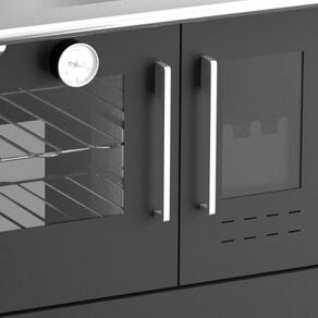 Chapa de alumínio, Forno, Grade do queimador em ferro fundido, Varão de proteção em inox, Interior do forninho e grade em inox 430, Visor do forninho em vidro temperado, Termômetro para conferir a temperatura do forninho, Mexedor de brasa, Pés com regulagem de altura, Porta do queimador com visor em vidroTipo